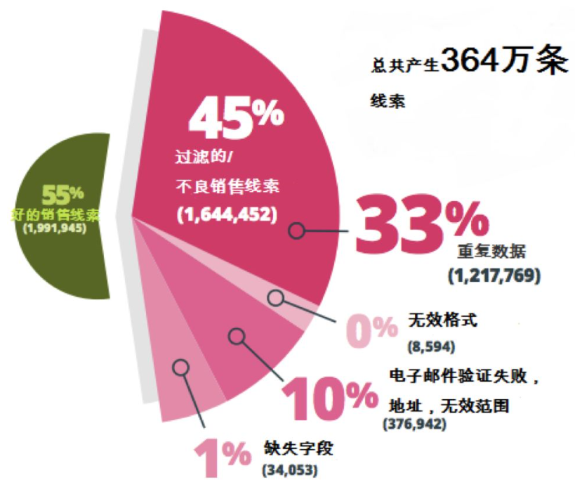 整合来自其平台一年的销售线索。从2016年9月到2017年8月,该公司364万条线索中55%的数据都是好的。重复数据阻塞数据库是迄今为止最大的问题,占不良销售线索数据的三分之一。