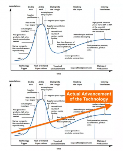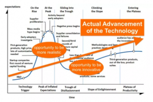 Scott在现场展示了Gartner这家分析公司在20年前做的一张图片,关于各类新科技的成熟演变的程度,从技术诞生的初创期,到期望膨胀的峰值期;比如说大数据的发展,但好像生意并没有因为采用大数据而变得更好,随着这种失望会出现低谷期,认为技术并没有带来实际的利益;随着技术的进一步发展,人们学会如何利用这些新技术,由此产生复苏期,以及第五个阶段,即成熟期。