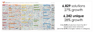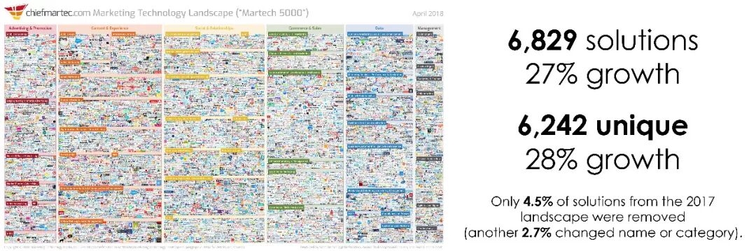 此外,这些营销技术公司旗下的产品或解决方案达到6829项,实现了27%的增长。并购也发生了,从2017年到2018年,近5%的企业被并购了。并购的发生,无疑说明资本的力量已经介入,行业的「野蛮生长期」成为过去。