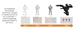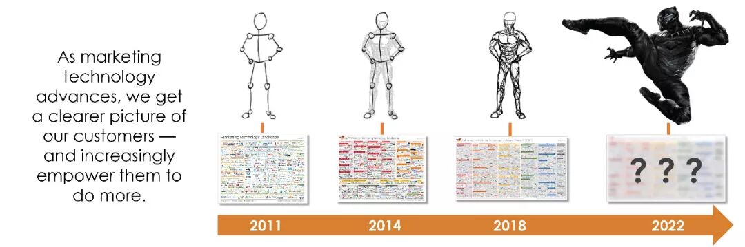与上一次演讲中重点介绍MarTech相关概念不同,这一次,Scott重点谈及营销技术行业的发展。首先,Scott展示了自2011年以来,所整理的MarTech Landscape,每年更新一版的行业布局图,会列举当年的营销技术公司。2011年的150家公司,包括了网站管理、早期的广告技术、搜索营销、邮件营销等技术;而2012年,公司数量增加到350家,并在两年后增加到1000家。