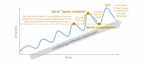 这张图一直在提醒所有营销技术行业的从业人员,我们所处的位置在哪里。即使认为自己达到了营销技术的巅峰,之后就会发生整合和收缩。Scott建议把这张图逆时针方向旋转45度,「因为整体而言,全球软件的数量是一直在增长,所以虽然有这样波浪的发展,但是整体而言是在向上发展。所以,即便我们进行收缩,未来几年营销技术行业会出现整合,整合之后的低点也比之前要更高。」