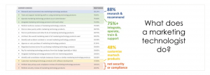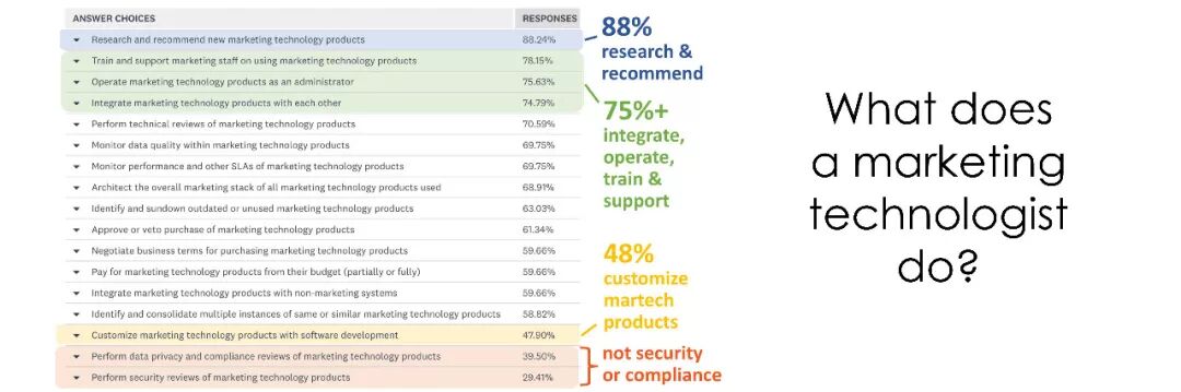 那么,究竟是营销、还是IT出身的人更适合营销技术官的职位呢?他们具体应该做什么呢?Scott组织对全球的营销技术官进行了调查,发现:88%的营销技术官是做研究和咨询;然后接下来的三项工作是培训和支持性的工作,即跨越技术鸿沟,最大程度利用营销技术。也有很大一部分人在做技术的运营,还有一部分人负责系统之间的整合,让系统能够更好的交互。
