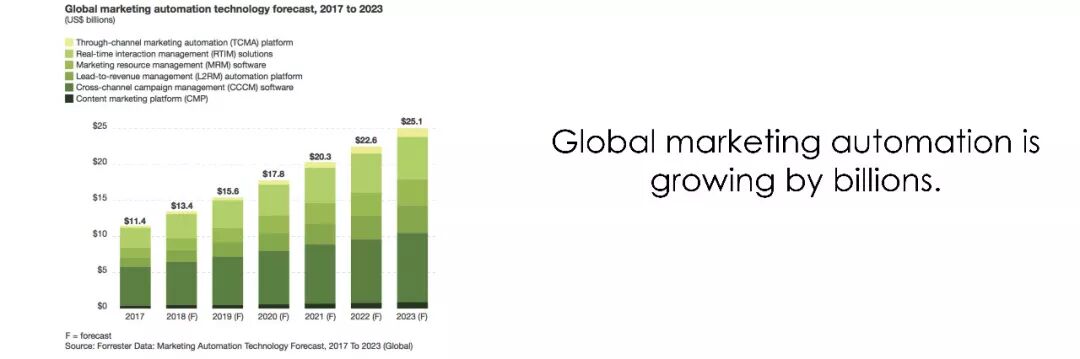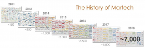 「2014年,B2B软件市场开始萌发,越来越多的商家开始介入到趋势当中,」Scott介绍说。随后的2015年,数字翻了一番,从1000家升至2000家,这个被普遍认为是营销技术的峰值的数字,保持了不过一年而已,很快在2016年数量几乎增加一倍。而最新的2018年,以西方国家为主的MarTech Landscape,涉及到的企业数量已经到达7000家,涵盖18种应用场景。