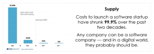 Scott将其归结为供需关系。首先在供应方面,供应成本越来越低。CBInsights曾做过调查:在2000年,需要500万美元的资金才能制作一套软件;而在云技术出现之后,进入软件领域的门槛越来越低,从2009年的5万美元,降至2011年的5000美元。「相信如果有最新的数据,那将会更低。」