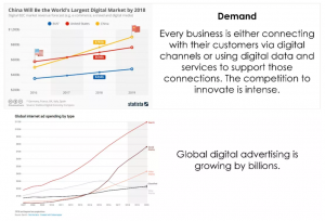而在需求端,整个世界已经进入数字化时代。消费者对数字化的要求越来越高,品牌也需要通过数字的方式同消费者交流和连接。即便在线下的交流,也会用到数字化技术。全球的数字广告行业是以数十亿美金的速度在增长,中国更是一个非常数字化的市场。