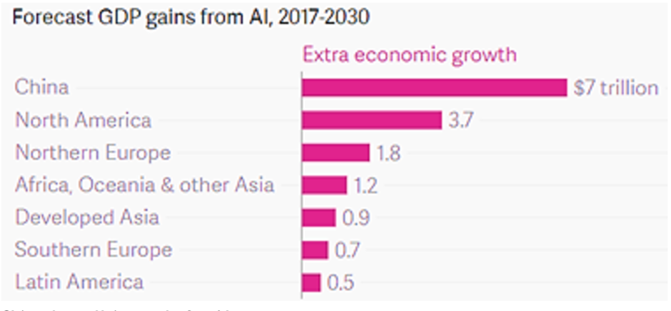 实际上,麦肯锡的研究也表明,人工智能在工作场所的自动化使得每年的GDP增长可能会增加0.8到1.4个百分点。埃森哲亦断言AI能帮助中国在2035年前实现经济增长率由6.3%提升至7.9%。基于普华永道的发现,这一增长意味着中国将获得额外的7万亿美元的GDP(2017-2030)增长,也意味着中国会成为AI发展的最大受益国之一。