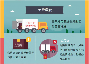 52%的消费者在购物车中添加更多的商品以获得免费送货服务,47%的购物者表示如果不包邮他们将放弃购物车。