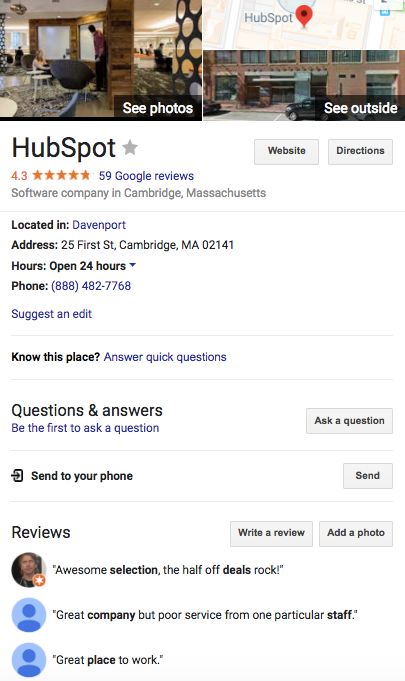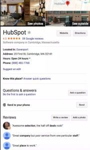 接下来,使用Google My Business在全球最大的搜索引擎上宣传你的业务,如果顾客在Google上搜索信息或在Google地图中搜索路线,潜在客户就可能找到你 (这对于试图吸引人流量的实体商户尤其重要)。人们还会使用谷歌发布评论,这些评论会显示在搜索结果中,如图所示,下图是你谷歌“HubSpot”的结果。