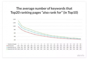 这张图表显示了排名靠前的网页中包含有其他有较好排名的关键词数量。这是丰满内容带来好处的真实案例:力求做一个有详细的和深入解读的内容丰富的网页。