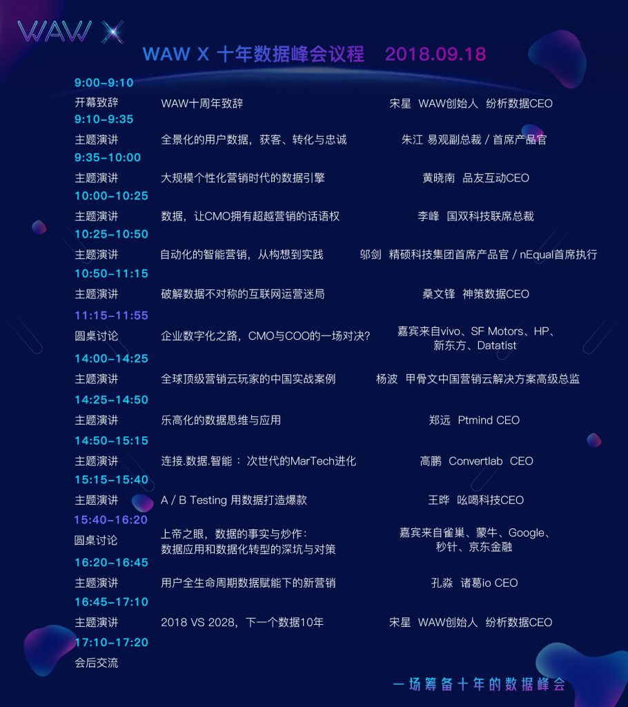 成立WAW十周年,也在小伙伴们的呼吁下,推出了WAW X数据精品峰会,邀请数字营销与运营圈最顶级的数据厂商和蒙牛、VIVO、SF Motors、新东方、HP等企业的数据营销与运营操盘者,一起聊聊数据,怎么读懂,怎么使用?