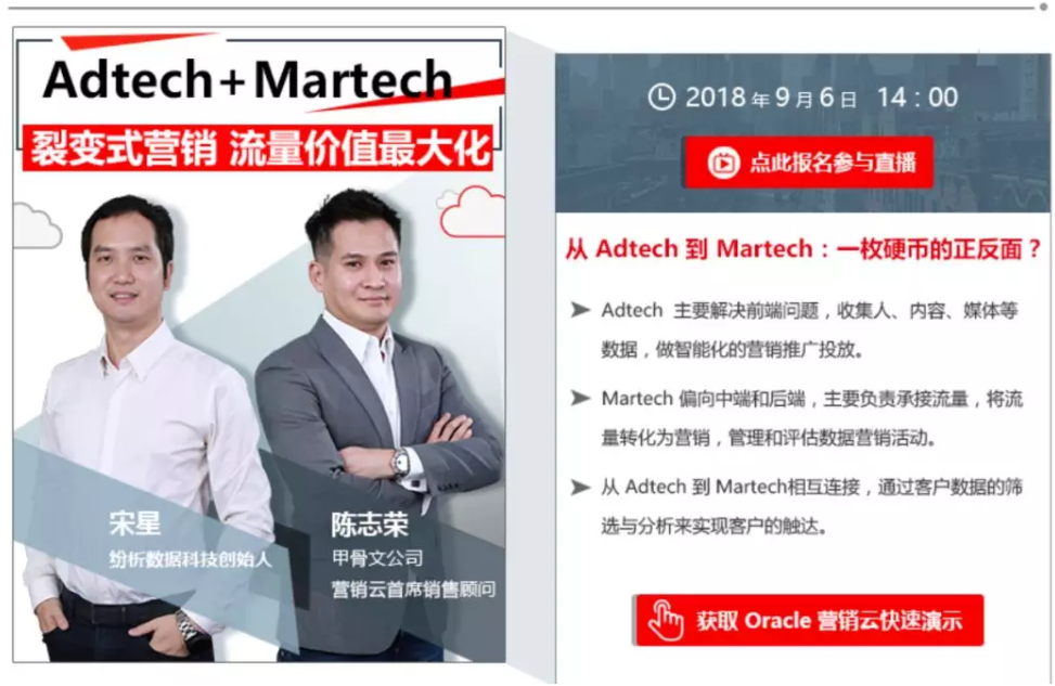9 月 6 日,互联网运营数据分析与优化专家,数字营销优化大师宋星,与甲骨文公司营销云首席顾问陈志荣同台对话,与您分享流量思维的变革与全渠道营销,现场干货不断,敬请期待。