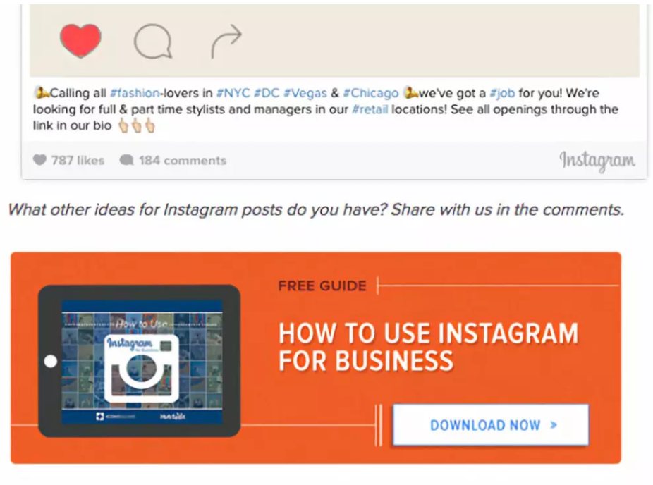 例如,在博客文章“在Instagram上发布啥:18个照片和视频创意来激发灵感”中,读者可以获得有内容的想法来创造有价值的Instagram内容。帖子最后是一个CTA,引导读者下载有关如何使用Instagram进行业务的综合指南: