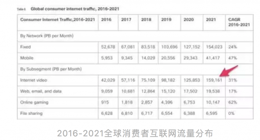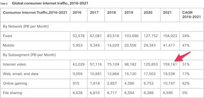 Cisco预测,“……网络视频流和下载正开始占据更大的带宽份额,到2021年将增长到所有消费者互联网流量的81%以上。”