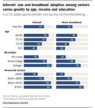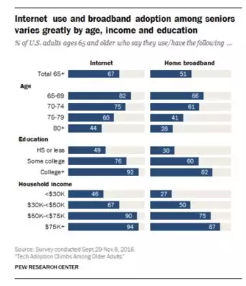 老年人的互联网使用和宽带普及率因年龄、收入和教育程度而异。