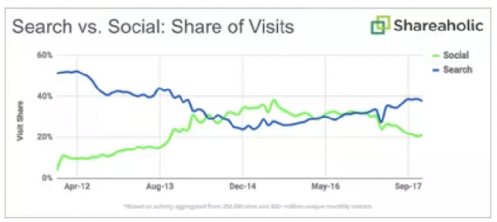 为了证明社交的价值,我们看看Shareaholic 2017年的流量报告。