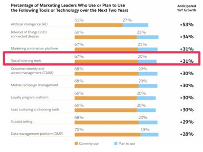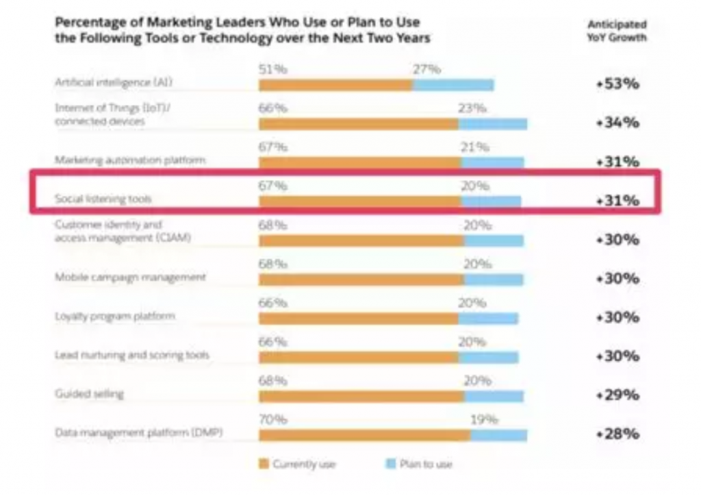 67%的市场营销负责人报告使用了社交收听工具,20%的人表示打算在未来一年开始使用。