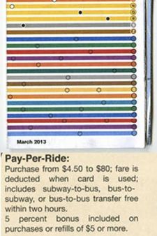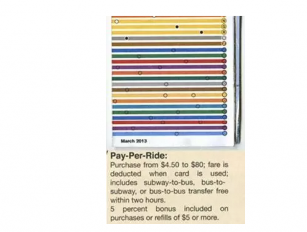 从4.5美元至80美元计费;使用卡时扣除车费;包括地铁至巴士、巴士至地铁或巴士至巴士转乘,两小时内免费。5%的奖金包括购买或补充5美元或以上。