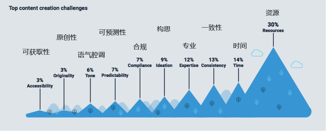 根据Acrolinx的报告,30%的受访者面临缺乏资源。如果一家企业想要在内容创建上深耕,缺乏的可能是预算和员工能力的提升两方面资源。
