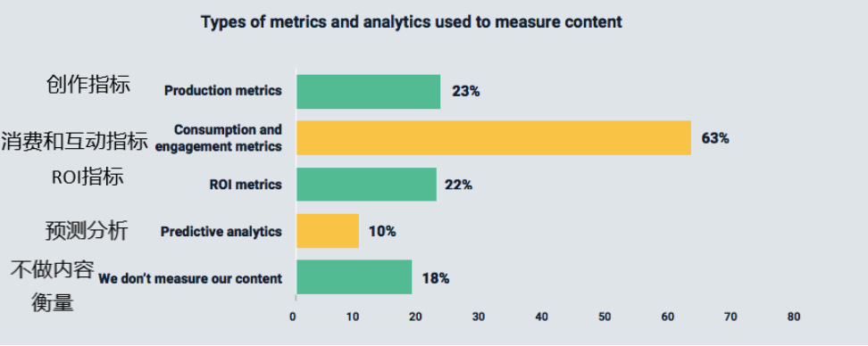 根据Acrolinx的报告,63%的受访者关注消费和互动指标,比如PV、网页停留时间、下载和注册。