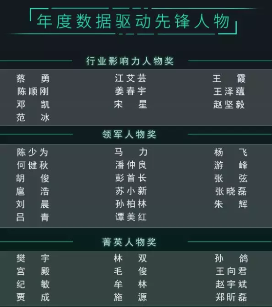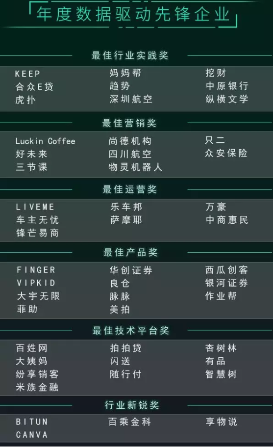 纷析数据创始人宋星、luckin coffee 联合创始人 & CMO 杨飞、奥美集团数据分析总监王泽蕴、中青旅移动事业部运营管理部执行总经理张晓磊等入选年度驱动先锋人物,他们所传递的思维闪光点为中国创新数据驱动道路提供切实的真知灼见;四川航空、智慧树、好未来、中原银行、纵横文学、VIPKID、华创证券、合众财富等凭借前沿的数据驱动应用和场景入选数据驱动先锋企业,其落地场景对全行业不乏借鉴意义。