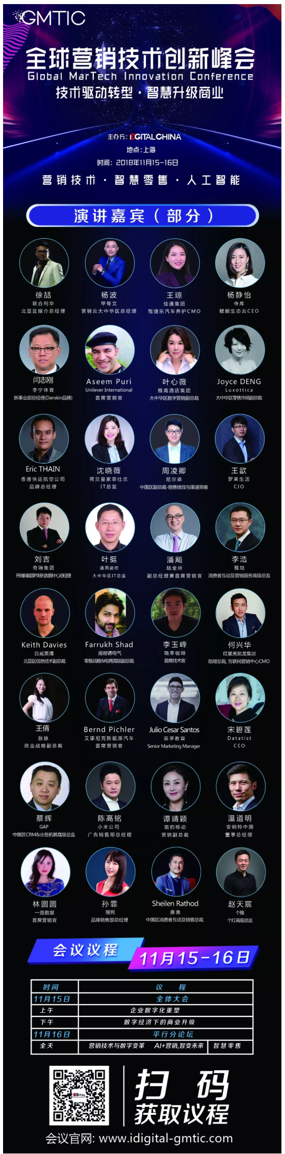 2018届GMTIC峰会围绕“营销技术、智慧零售、人工智能”展开了多场次、多形式、多角度的Martech分享交流活动,主题紧贴AI/智慧零售/Martech等行业热点话题(完整议程扫描文中二维码获取):