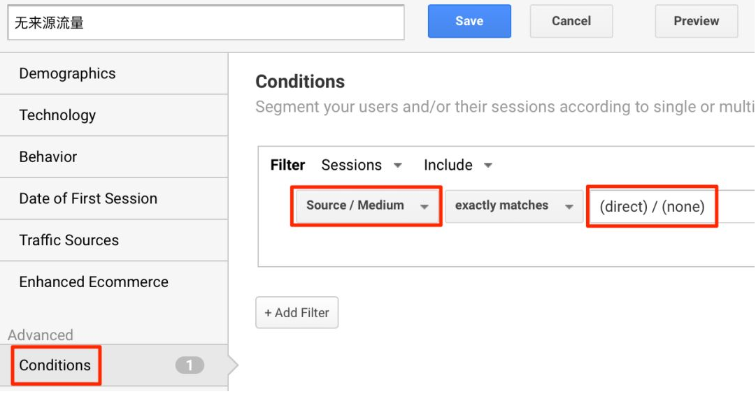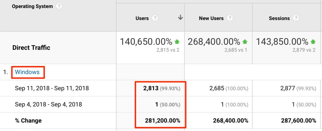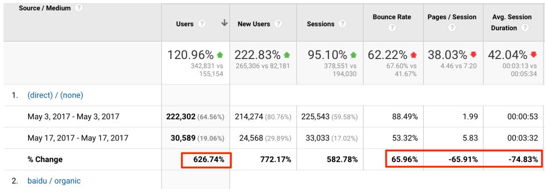 多数情况下的异常流量都是没有来源信息的,在GA里的来源/媒介是:(direct) / (none),所以如果我们发现无来源的流量有明显上涨,那就需要注意了。