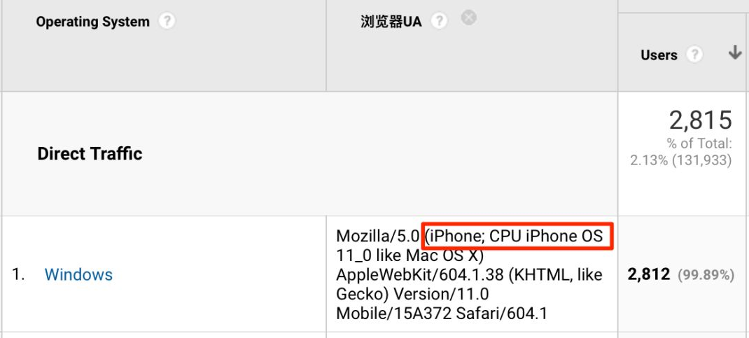 我们再调出次级维度,看看浏览器UA的信息。结果这下更不得了,Windows居然用上了iPhone浏览器,这流量的异常算是证实了。(这里需要解释一下:这个“浏览器UA”是我们在GA中配置的自定义维度1,然后需要在统计代码中加入: