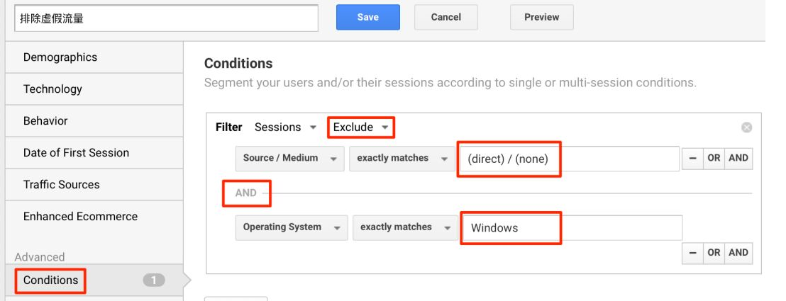 当我们找到了异常流量的特征,后续的事情就简单了:建一个高级细分,将Windows系统并且浏览器UA中包含iPhone的会话排除掉,这些异常流量就消失了。
