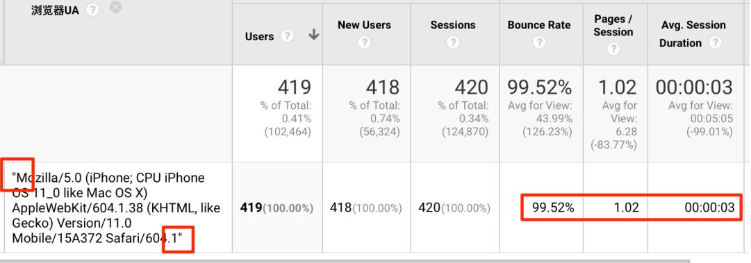 以上是“发现-分析-排除”异常流量的一个案例,可以看到其中最重要的步骤其实是第二步——只有在某些维度上能够精准筛选出异常流量,才能在不影响正常流量的情况下将其排除。以下是我最近遇到的另一个异常流量,它的特征是浏览器UA开头结尾都带有双引号(正常情况不该有):