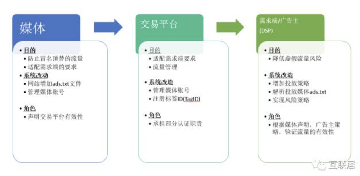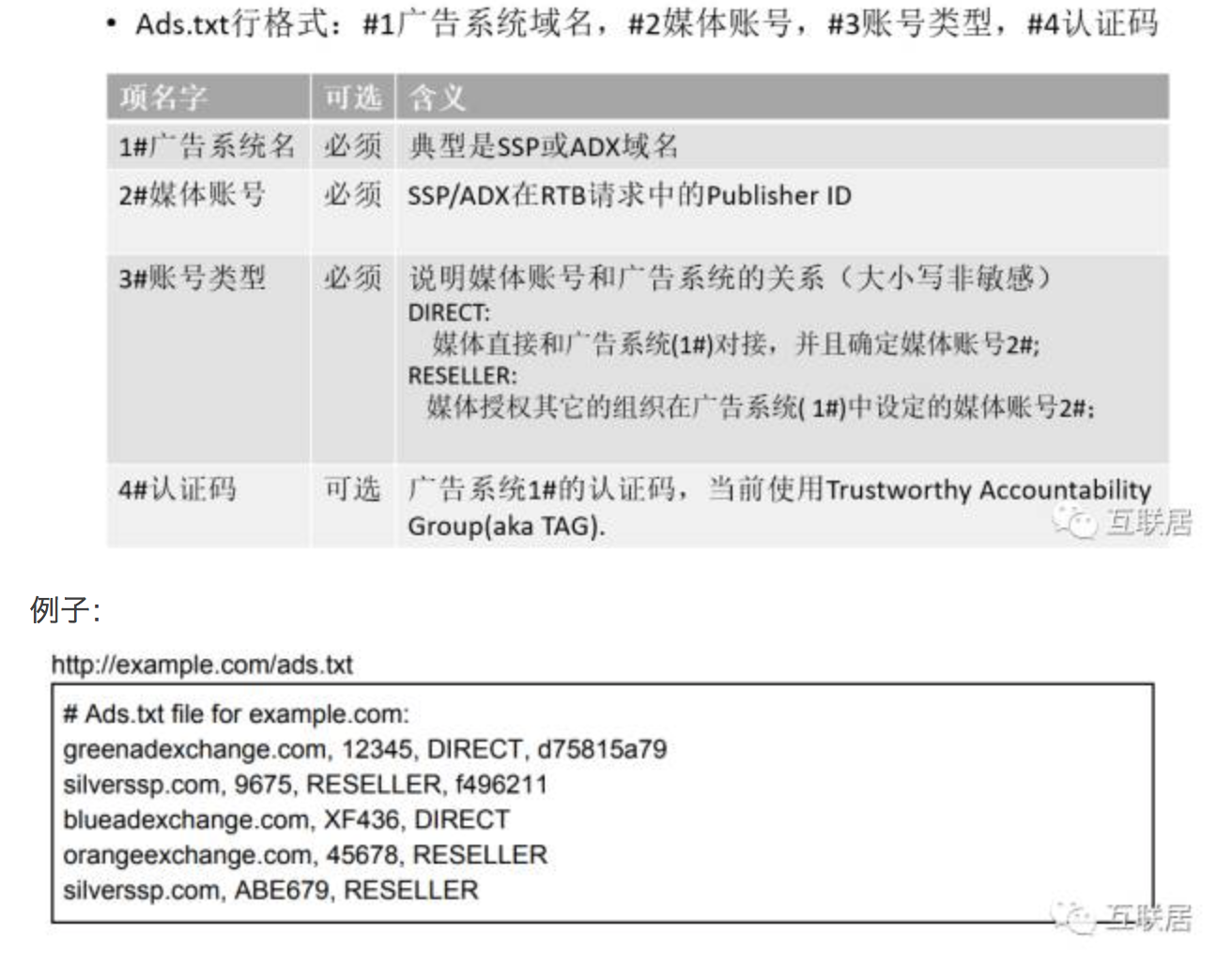 这个技术初心很简单:现在大部分反欺诈技术都在DSP端,上游的流量却是清污混杂。那么如果在尽可能上游进行一些认证标识,那么可以减少下游DSP的判定难度,或者规避一些简单的作假方案。因此,技术方案就是在媒体端增加一个ads.txt,用于描述这个媒体的流量都会接入到哪些广告平台(ADX),媒体在这些广告平台的ID是什么? 这样DSP就可以根据这个描述文件做一些策略,降低虚假流量风险,例如确认这个媒体的流量来自于ads.txt中描述的ADX。