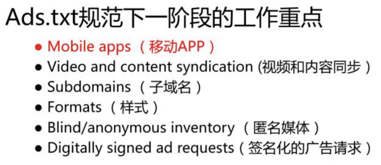 Ads.txt的版本才是1.0版本,标准的限制还很多,因此很多重要的功能在下一版本,特别是移动app的支持。