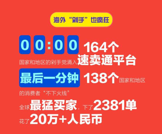 一小时内,199个国家和地区的买家下单。最后一分钟,仍有138个国家和地区的消费者购买商品。