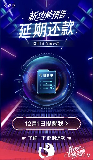 支付宝提醒,延期还款功能将于12月1日上线。延期还款指南显示,该功能可在每月1号出账日之后至10号还款日之前使用。