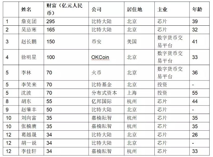 比特大陆和嘉楠耘智这两家公司的上榜人数最多,分别有5位和3位,占全榜单的一半以上。加上亿邦科技,这三家公司是世界排名前三的数字货币矿机生产商,囊括全球九成以上的份额。比特大陆39岁的詹克团以财富295亿元成为“区块链大王”
