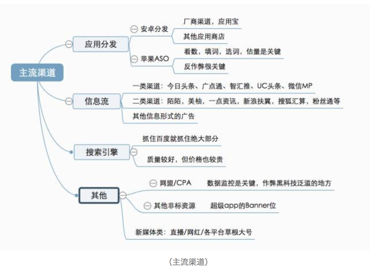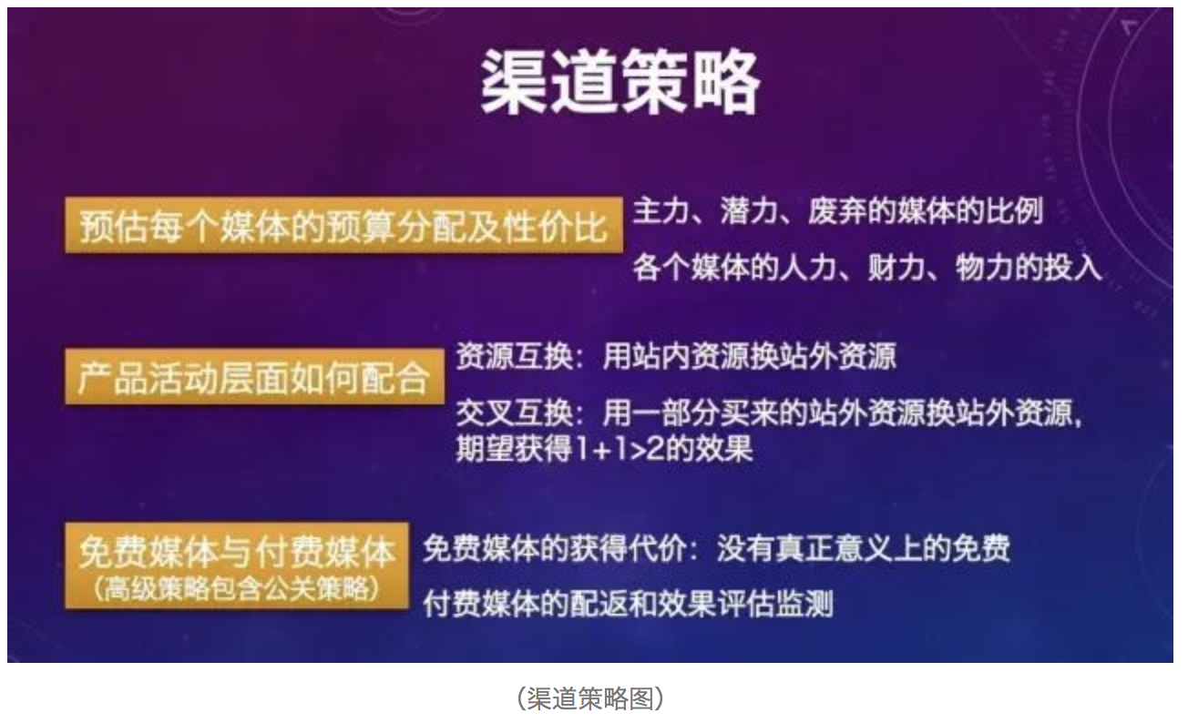 营销的本质是对人性的洞察,渠道策略是这个洞察的初步体现,一般来说渠道策略包括,在一定预算下,一定时间内,每个渠道(主力,潜力,废弃)的投入(财力,人力,物力)与预估结果,产品活动的配合,付费渠道和免费渠道的搭配,付费渠道的配返(和代理的博弈),效果评估(数据评判标准,反作弊标准)。这些工作的内容不是一成不变的,毕竟流量也在一直变,根据实际情况调整就好,但这个计划是一定要有的。