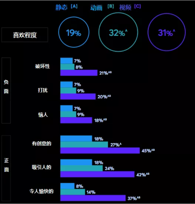 静态广告获得了最多的屏幕时间,这是合理的,因为它们的尺寸较小,但动画广告获得了更多的观看次数。四分之三的人在观看动画广告。动画广告在正面(娱乐,吸引人)和负面(烦人,打断)类别中的得分也超过了静态广告。然而,正面的差异要大得多,这又是为什么呢?