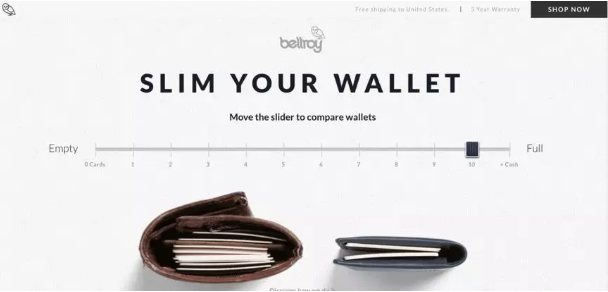 还有一个互动部分就是展示了与不同钱包相比,薄款钱包装满是什么样子的。当用户沿着一条线来回移动滑块时,两个钱包都装满了卡片和现金,很明显地展示了Bellroy的薄款钱包的好处。