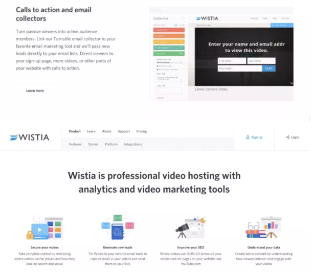 如果继续滚动鼠标,会看到一个包含Wistia功能信息视频,即 calls-to-action;电子邮件收集器;视频热图和观看趋势。