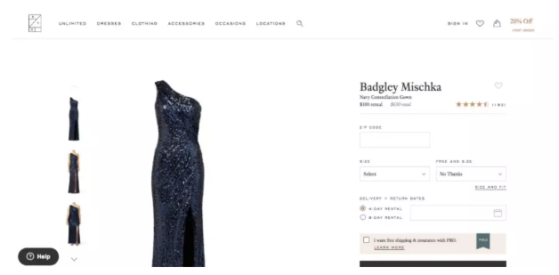 Rent the Runway为其租赁的每件衣服设计一个单独的产品页面,其中包含客户可能想知道的所有信息 – 图像,尺寸,面料,价格和评价。到底是什么让他们如此与众不同呢? 那就是“造型记录”和“尺寸&大小”部分的特殊细节展示。