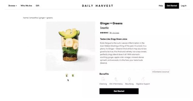 查看Daily Harvest的冰沙产品页面。你不仅可以看到冰沙的样子,还可以将鼠标悬停在主图像下方的左边预览图标上,它会向你展示用于制作此饮品的食材。向下滚动,你会看到每种成分及其简单描述。