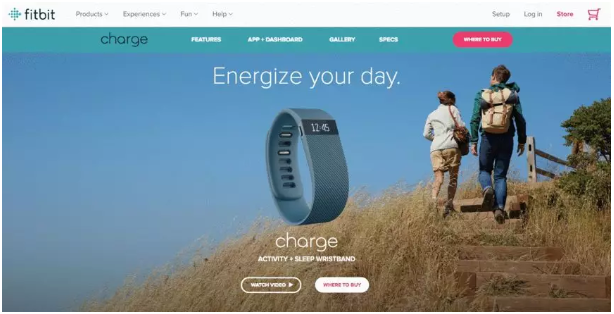 下方页面展示了最初版的Fitbit Charge – 现在已经是Fitbit 第三版了——一开始就阐述其产品的价值观念,而不是一系列功能。展示了一个登山人的英雄形象,我们可以想象他穿着Fitbits,文案是“让你每天都充满活力”。