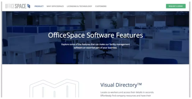 OfficeSpace销售设施管理软件,帮助人们管理办公空间。与名称一样,产品页面非常清晰明了。本产品页面的每个部分都专用于介绍该软件的不同功能。标题说明了该功能,副标题解释了为什么在评估不同软件时此功能很重要。这使得潜在客户很容易快速消化产品提供的内容,但如果他们愿意,还可以阅读有关其价值主张的更多详细信息。而且,如果有人想要了解更多有关特定功能的信息,也会有明确的指导说明。深蓝色OfficeSpace软件产品页面