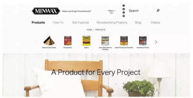 Minwax生产的产品可以帮助人们维护木制家具及其表面。其实就是铆钉,对吧?但该品牌已设法创建了一个不仅内容相关的,而且还能帮助用户快速,轻松地找到正在寻找的东西的产品页面。这部分归功于Minwax Product Finder模块。它的功能类似于测验,询问一系列多项选择题,例如“是什么类型的项目所需?”和“你想做什么?”一旦你回答了问题,测验就会生成推荐的产品,其中包括一个便捷的“请勿忘记”列表,其中包含你完成工作所需的工具 – 安全眼镜,手套和砂纸等。像这样的有用提示超越了普通的电子商务产品页面。Minwax产品页面,带有产品搜索框