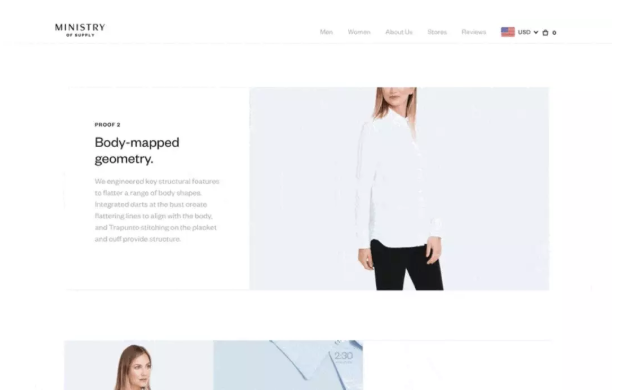 Ministry of Supply专门为客户提供舒适的正装,它力争在任何一个产品登陆页面体现其舒适度。以下面的Juno女式衬衫的产品页面为例。在产品的女模特照片库下方,为顾客提供了实例展示,揭示了女式衬衫的生产步骤,材料和对比其他产品独一无二的高级品质。产品页面的最佳特性可能是用动图体现的,或者采用循环播放的视频来展示服装的弹性和灵活性。产品描述它描述了其产品的技术优势,但没有服务态度并没有因此而下降: