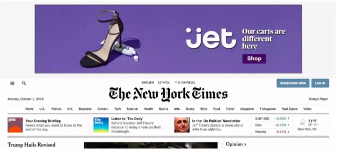 例如,这是一个纽约时报首页上的jet.com的广告,你肯定明确知道这是广告吧。
