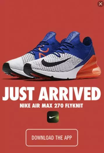 - 弹出广告:有趣的是弹出广告是两个活动之间弹出的全屏广告,例如点击这一页到下一页或者到页面的下一个层级。像Pinterest和Yelp这样的平台过去常用弹出广告提升下载量,但是Google在2016年让这个做法画上句号。现在,他们常见于游戏的不同关卡,比如我在和朋友玩文字游戏时看到的Nike广告。