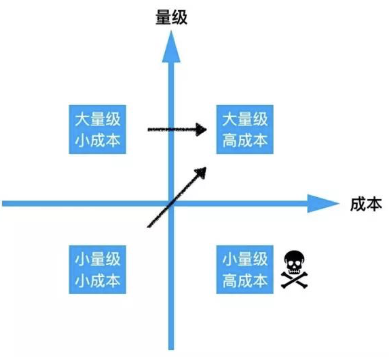 如果我选择新浪粉丝通,定向投放宝妈,我可能每天能拿到500个注册,成本10元/个。如果我想扩大量级,我只能增加投放维度,把小镇青年也加进来,每天拿到2000个注册,成本就变成了15元/个。如果还要提升量级,我只好向刚毕业的学生投放广告了,最后成本可能提升到20元/个。