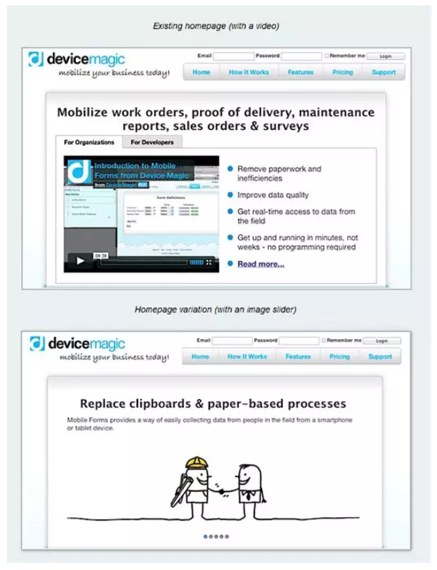 然而对于DeviceMagic公司,这一理论并非完全适用。反倒是滑动播放式广告功能,比视频介绍功能,提升了更大幅度(30%)的注册率增长。