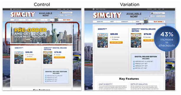 他们刚发布SimCity第5版的前两周,有一半的销售业绩都来自游戏下载。这要归功于EA公司在对这款游戏的登陆页设计做出任何一处调整前,都要进行A/B测试来辅助决策。