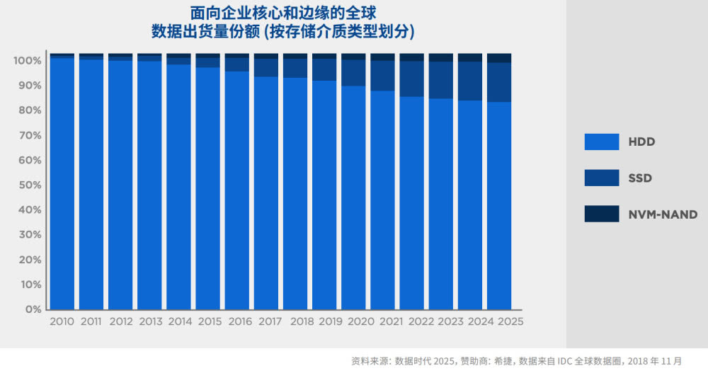 此外,尽管数据爆炸产生的存储需求一直在增长,但存储介质的依然变化不大。IDC预计从2018年到2025年,所有介质类型的存储容量出货量必须超过22ZB,这其中有近59%的容量来自HDD产业,到2025年末,超过用于核心及边缘的企业存储有80%将依然采用HDD介质。